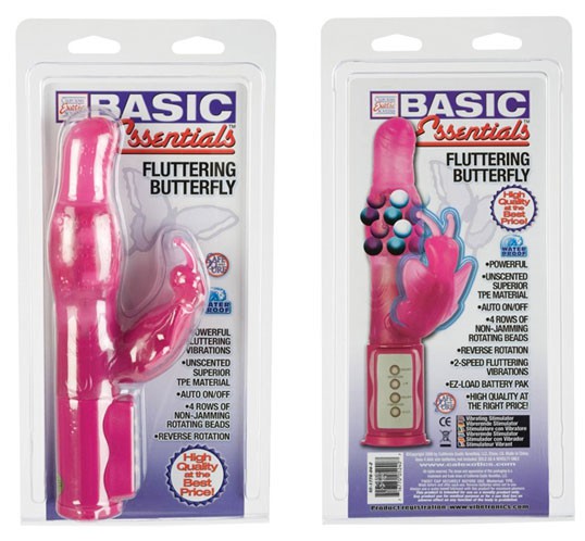 Vibrador BASIC ESSENTIAL BUTTERFLY MARIPOSA. Tiene 2 velocidades, 4 filas de bolas giratorias, estimulación simultánea de la zona del clítoris y vagina. Longitud total – 18 cm, longitud de trabajo – 14 cm, diámetro – 4 cm.